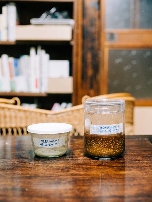 潰した大豆を即座にパンダの生麹と練り合わせ、団子状にしたものをタルに投げ入れます。